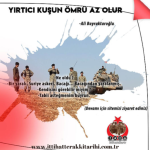 ‘Korkma, merak etme, iyi olacaksın, ben Türk askeriyim bize inan kardeşim.’ dedi. O ana kadar sancısıyla kavrulan ve etrafına kayıtsız kalan yaralı bu sözlerin üzerine irkildi önce sonra ise başını ondan yana çevirdi. Gözlerini dikerek iniltiyle sordu ‘Sen… Sen Türk askeri misin ?’. ‘Evet, evet ben Türküm askerim.’ dedi . Elini Arap askerinin eline koydu ve elini sıktı. Öylesine bir tokalaşmaydı, öylesine bir sarılmaydı ki bu sanki coğrafyalar sarılıyor, hasretinden eriyen dağlar su olup birbirine karışıyordu. Eller kollar değil kalpler sarılıyordu sanki. Bir başka manası vardı bu sarılmanın. Çanakkale’di bu sarılma, Yemen’di, Kut’ul Amare’ydi ve Barışpınarı’ydı, Zeytindalı’ydı, Fırat Kalkanı’ydı. Kısacık o sarılmanın nihayetinde ‘Şükran’dedi yaralı ve gözlerini Türk olduğunu az önce öğrendiği askerin gözlerinden ayırmadan bir kez daha Allah dedi. Sonra yumuşadı ve düştü eli. Son nefesini verdi şimdi Hakk’ın divanına ulaştı.